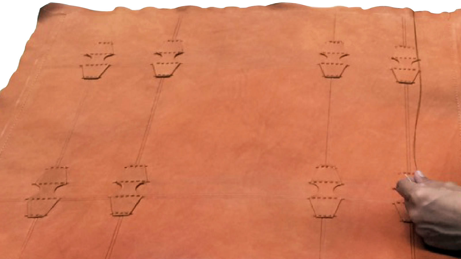 - そして、その木枠に染色や仕上げ加工を施していない「ヌメ革」を一枚ずつ貼りながら、トランクケースの形へと仕上げていきます。